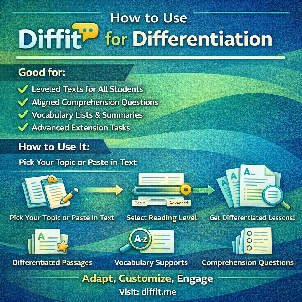 Diffit works through a simple interface. You choose your topic or paste in a text, select the desired reading level, and the tool generates a customized set of resources. This includes differentiated passages, vocabulary supports, and comprehension questions. Teachers can quickly select the level that matches each group of students, making it easy to provide multiple entry points into the same lesson without rewriting everything by hand.