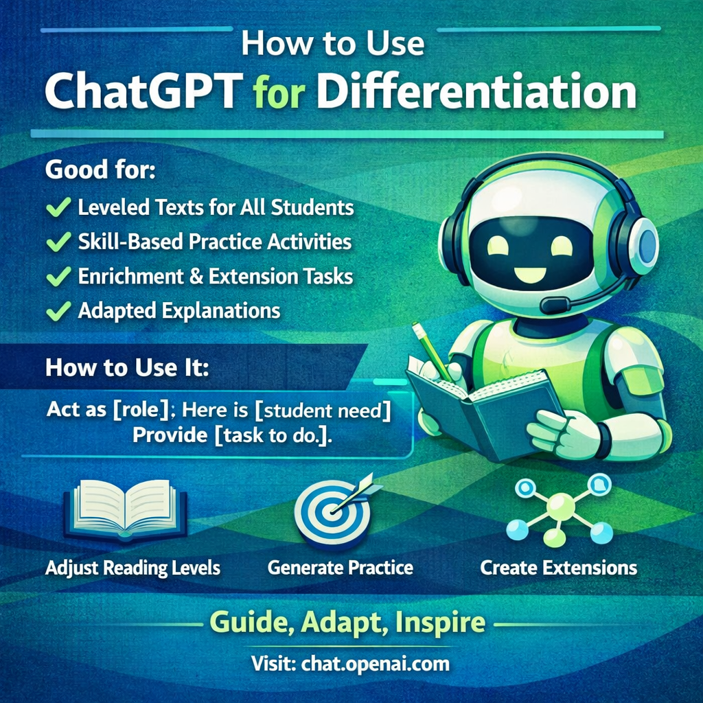 ChatGPT works well with the prompting template introduced in the book: Act as [role]. Here is [student need or content]. Provide [what you want the AI to do]. This structure helps guide the tool to produce clear and useful results. For differentiation, you might use it to adjust reading levels, generate targeted practice, or design alternate entry points for students working on the same concept. -